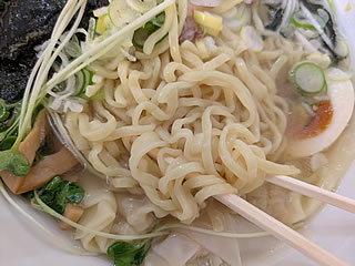 こちらは喜多方の平打ち縮れ麺ほど幅広くないが、通常の中太よりやや太めの感じ。