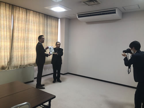 写真は、そのうち大戸同窓会長から私学協会の森 涼会長へ贈呈した模様を新聞記者が撮影しているところ・・