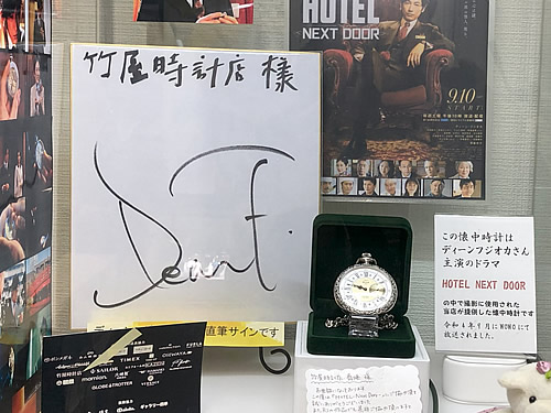 店主さんに聞いてみると、これは上川隆也がドラマ『執事 西園寺の名推理』の中で用いた懐中時計を貸し出した時に貰ったサインだそう。