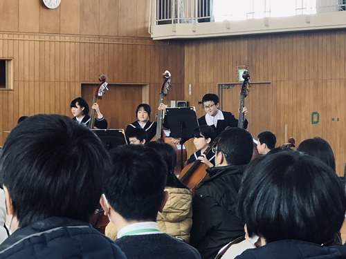 楽団の右端でコントラバスを抱えているのがカナト君。同級生の中では身体が大きい方なので任されたかな。