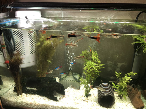 水流を加え、稚魚の隠れ家を造り、水草を植えて浮き草を浮かべ、七色照明を設置して、主にグッピーやヤマトヌマエビ50匹くらいが共同生活。(生まれたての赤ちゃんも多数)
