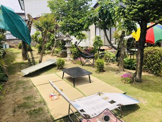 待てよ、食べ疲れ・飲み疲れで休憩する『奥の院』もあった方がいいんじゃないかということで、植え込みの反対側にも四畳半+リクライニング・チェアなどを配置。