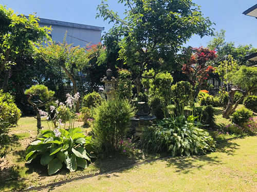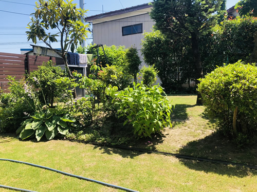 左の木塀の向こう、元々我が家の実家があった場所には新築の家が二軒建ち並んでいますが、以前はその庭まで僕が世話をしていました。