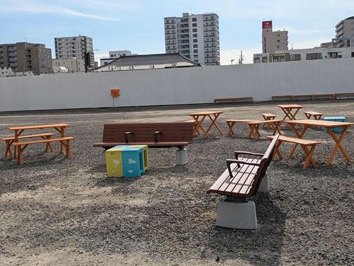 今まで旧施設の解体工事が行われていましたが、一段落したのでその一部が休憩スペースとして共用されているのです。(お店も無いので誰も休憩してないけど:笑)