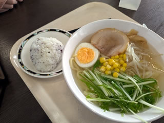 ダイエット中のケイ子はゆかりオニギリ、僕はシンプルイズベストの塩ラーメンです。