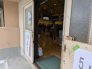 車を止めて、着いたことをサオリに報告しようと体育館へ。おお、赤い服着て陣頭指揮をしていました。