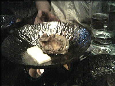 その後もいくつかの料理が続きまして…。突如、目の前に登場いたしましたのが、これまた巨大なアワビ。しかも…