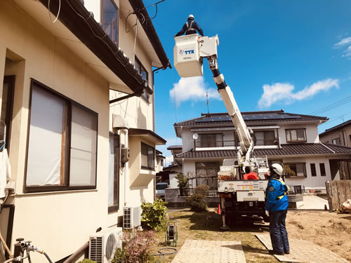 下で見上げているお姉さんは別会社の警備員で、TTKのイケメンお兄さんが一人でクレーンを操作しながら屋根に迫っております。
