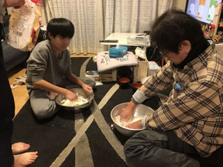 はい、このところ成長著しい孫のヒビキ君と僕が練っておりますのは、大晦日恒例、手打ちうどん!!