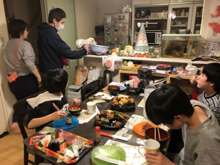 という情報が入りまして、結局はレストラン・メヒコの仕出し弁当で対応することになり、ジュンイチ夫妻に子供二人も加わり、大人数になったお正月イベントがコチラ。