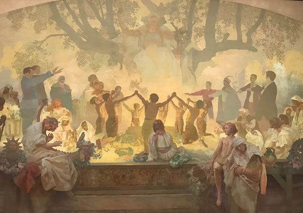 それから、この通信のBGMに使用したラヴェルの“水の戯れ”は、ミュシャが大好きだった曲で、スメタナの“我が祖国”とともに、彼が「スラブ叙事詩」の製作を決意したきっかけとなった作品とも言われているんだよ。