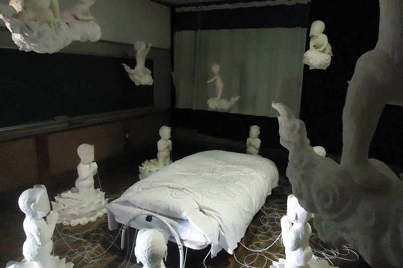 |制作年|2011| |材質|牛乳パックの再生パルプ・布・ベッド・テグス・和紙・ひも|