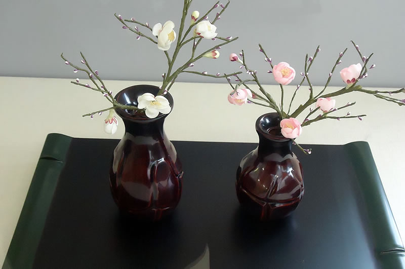 花瓶の松皮、竹の盛り上げは錆下地で、梅を生けることで完成する松竹梅、吉祥の一輪差です。