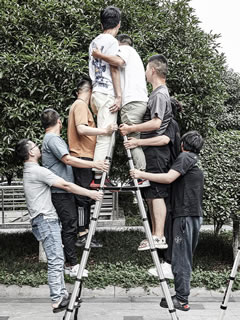 足場?・・訝っていると、後輩がどこからともなく植木用の携帯梯子を出して来る。