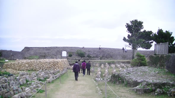 その後15世紀に入り、別の城から移って来た護佐丸盛春(ごさまるせいしゅん)という人物が三の郭や北の郭を増築して今の姿になったと。 ところがこの護佐丸さん、建築名人だったようで、増築部分は「相方積み」という高度な技法を使い、先に出来ていた「一の郭」の二つの城門もアーチ式に組み替えたそうで。