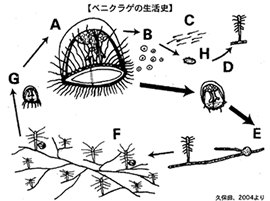 ◆成体(雌雄異体の成熟クラゲ)が有性生殖し、受精卵から育ったプラヌラ幼生が、岩などに付着して植物の根のような走根を伸ばし、若い世代のポリプ個虫が多数伸び上がり、無性生殖で増えていく。