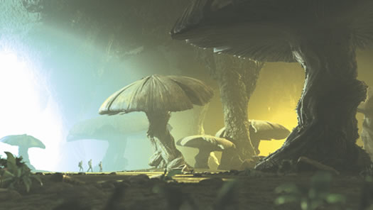 その大洞窟はオーロラのような発光現象で明るく照らされており、地下の大海があり、キノコの森が繁茂して恐竜や原始的な生活を営む人類も存在していました。