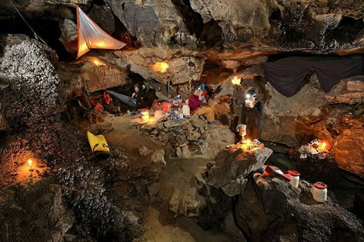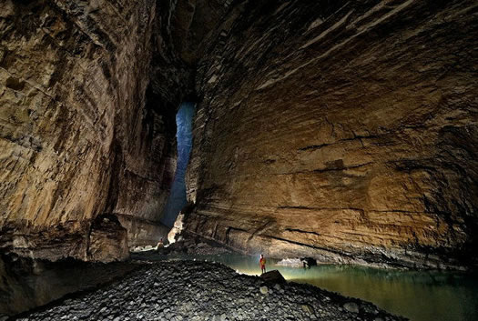 一瞬、大きさの観念が掴めないかもしれませんが、写真中央部の下、地底湖のほとりに佇んでいるのが調査隊員の一人です。