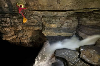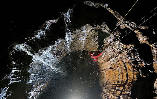 豊富な水分が霧となって洞窟内を覆っています。下が見えない中を降る……どんな気分なのでしょうか。