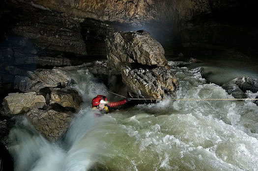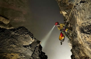 洞窟の入り口にロープで降りて来る隊員が左上に見えます。