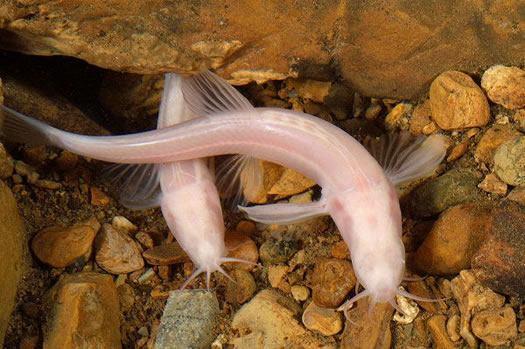 太陽の光が届かないため体色が白化しており、退化によって目が無くなっています。