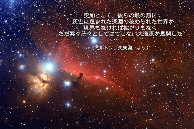 赤い発光星雲の手前にある宇宙塵が偶然に馬の首のような造形を作り上げました。