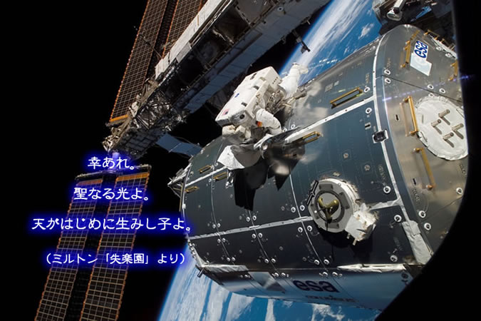 国際逢い宇宙ステーション(ISS)の船外で、コロンバス実験棟を組み立てている飛行士の写真です。
