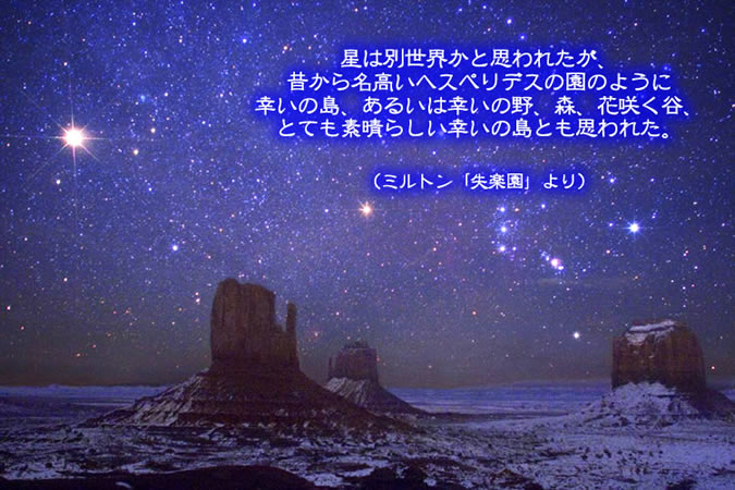左上の明るい星は火星で、右の地平線上には、アルニラム・アルニタク・ミンタカのオリオンの三ツ星が見えています。