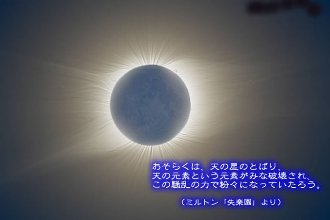 露出を変えた28枚のデジタル画像を重ねて、太陽コロナの揺らぎが捉えられています。