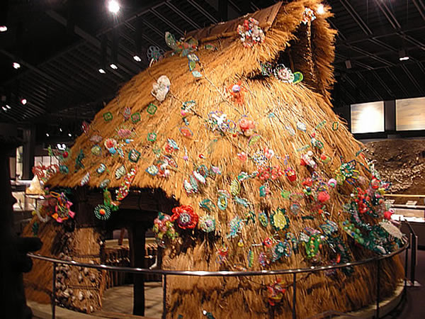 考古コーナーの竪穴識住居にトッピングされた針金やストローで造られた花たち。