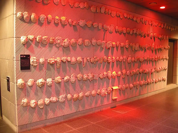 自然史展示コーナーへと続く通路の壁にかけられたおびただしい数の仮面たち。