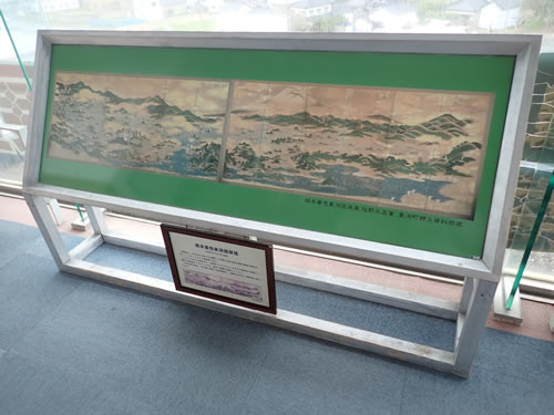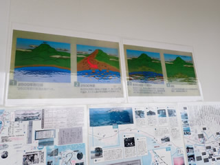 江戸時代の浮島の絵図(隆起前)と現代隆起地形を見比べられる。