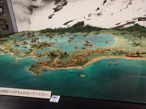 象潟江戸前半の浮島模型。潟中央手前が蚶満寺。