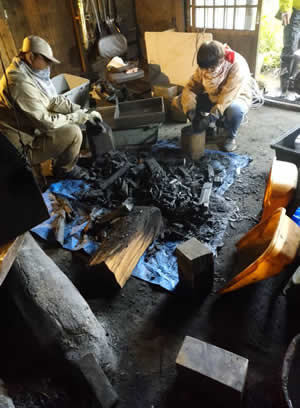 屋内鍛とう場での炭切りは粉が充満して良くないこと苦笑。