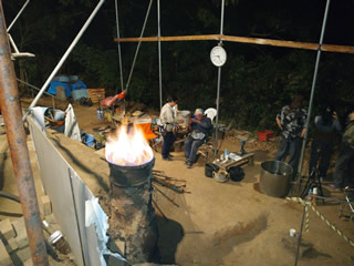 初めて木槌を持って炭や砂鉄の上を叩く係になる。