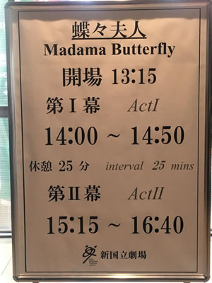 演目はプッチーニ作曲「蝶々夫人」。4日間公演の3日目に出掛けた。このプロダクション(演出:栗山民也)は2005年にこの劇場に初登場し、今回は実に9回目の上演。私も2011年以来5回目の鑑賞だ。