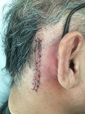 三叉神経痛の原因となっている脳深部血管の三叉神経への圧迫を手術によって取り除きます。手術は全身麻酔下、病側を上にした側臥位で行われます。病側の耳の後ろで毛髪を部分的に剃毛します。毛髪が生えていた範囲内で7cm程度の直線状の皮膚切開をおこない、筋層を剥離し頭蓋骨(後頭骨)を露出させ、医療用のドリルなどを用いて長径で4cm程度の小開頭を施行します。この際にくり抜いた骨は手術終了時にはめ込み、チタン製の金属で固定します。