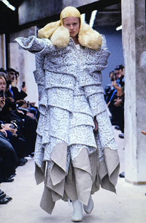 「コム デ ギャルソン」は、ジュートなど粗い麻素材が多く、出来上がった服を大きな機械に入れて丸洗いしてダメージを与えるという新しい手法を採用している。「新しい感覚や価値観、ポジティブな気持ちを作りだすことを信じて制作した」と川久保玲。