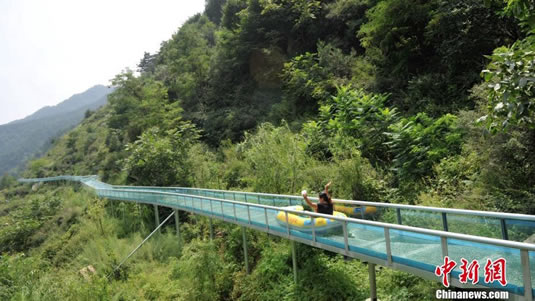 で、そう言う話を聞くと黙ってはいられないのが中国。何でも「世界一」になりたいと造ったのがこちら、長さ1000メーターのガラスすべり台。
