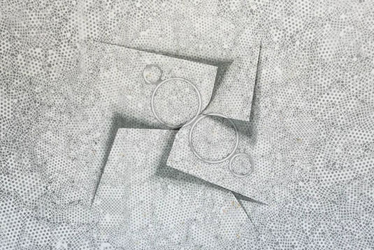 中央で「4枚の紙」の端がせめぎ合い、互いに「上」へ乗り上げています。まるでエッシャーの無限階段のよう。