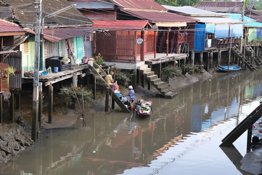 訪れたのはタイ北部の集落でしたが、現在、バンコク周辺でもこのような集落が残っているようです。(バンコク近郊「アンパワー地区」の水辺集落↓)
