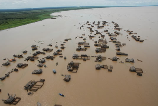 これはハウス・ボートではなく、海面が上昇しても居住できる本格的なフローティング・ハウス。100軒近くの家屋がアイマ湖の岸壁に係留され停泊しています。