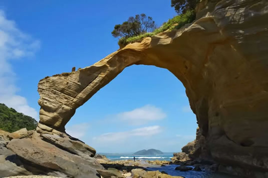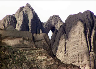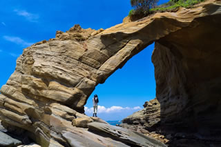 このような形の「天然橋(ナチュラル・アーチ)」は、「アーチ岩」や「岩門」「石門」などと呼ばれ、硬い岩盤層が「風化」や「侵食」によって削り出されたり、「鍾乳洞の崩壊」等によって形成されます。