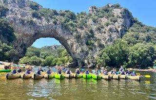 アーチの下を流れるアルデッシュ川は、写真のように「カヌ―やカヤックの聖地」とされており、色々な競技が催される場所です。
