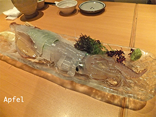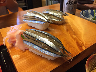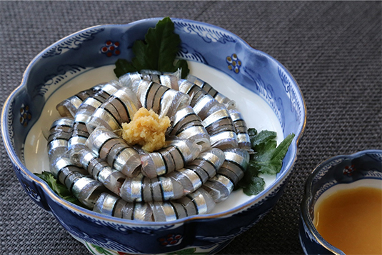 ニシン科で体調10センチほど小魚ですが、身体の半分が銀色、残り半分が半透明で、キラキラした身をショウガ酢味噌につけていただきました。