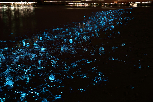 これは「ホタルイカの身投げ」と言われるもので、富山湾の浜辺に青白く光るホタルイカの大群が打ち上げられています。