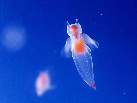「氷の妖精」などと呼ばれるクリオネですが、元々は巻貝の仲間。成長すると貝殻が無くなり、内臓以外は透明な姿になります。