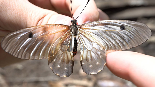 オーストラリアやパプアニューギニアだけに生息する「アゲハ」の仲間で、ウスバ(薄翅)の名の通り、透明な羽根を持つ蝶。