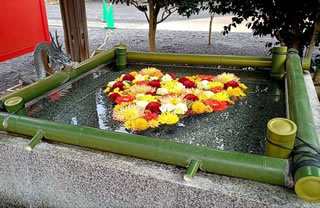 柏の布施弁天の花手水。 花を最後に持ってきてやな、 でも食いもんVS花が2対1で、 (配信:2025.5.8