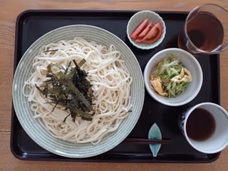 てなわけでさっそく、にーさんのうどん3玉御膳。 ちょうどいい皿がこれしかなくて、iittalaの平皿にうどんが盛り広がる。 かーちゃんのは、うどんだけちょっと分けてもらって、きゅうりと水菜の中華合え、茹でもやし、茗荷の甘酢漬け、鶏そぼろを盛った上から白だし少々、野菜多すぎぶっかけうどん。 シンプル・イズ・ベストな男性陣と対照に、具いっぱいが好きなもんで。 うむうむ、ええ感じや。 (配信:2025.8.7